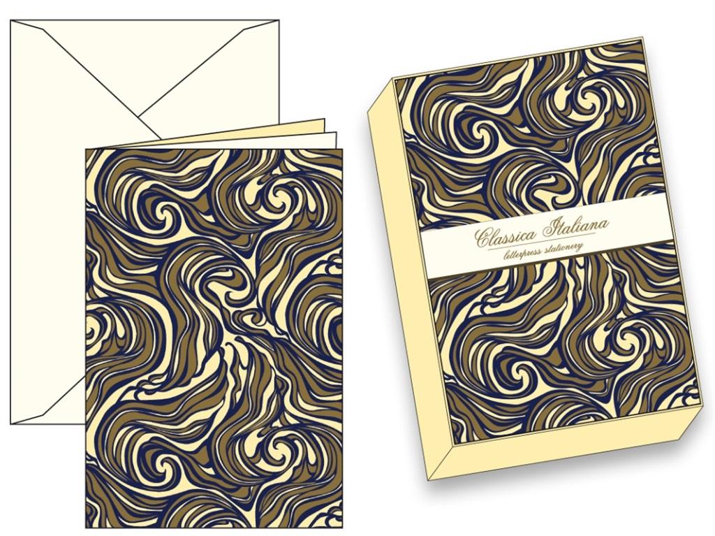 Papeteria w ozdobnym pudełku, papier o gramaturze 250g/m2. W zestawie znajduje się 10 kopert i 10 karnetów.