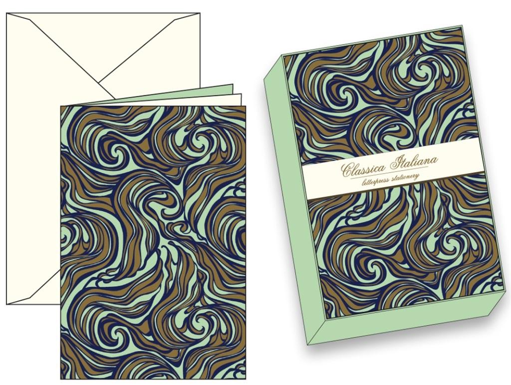 Papeteria w ozdobnym pudełku, papier o gramaturze 250g/m2. W zestawie znajduje się 10 kopert i 10 karnetów.