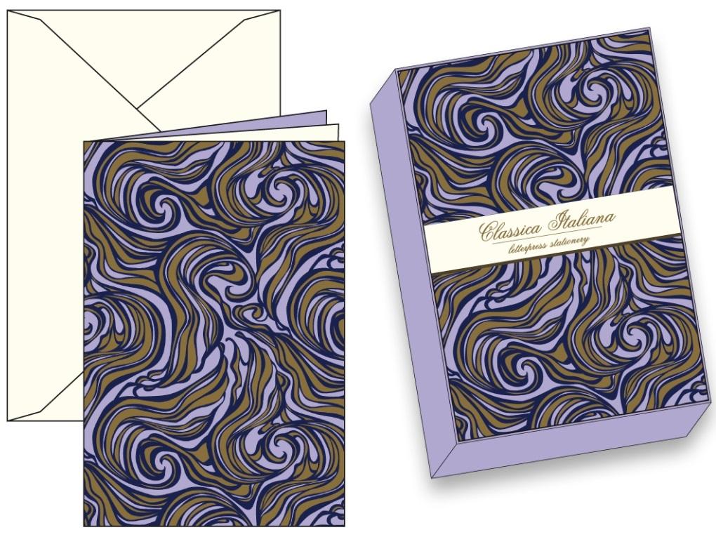 Papeteria w ozdobnym pudełku, papier o gramaturze 250g/m2. W zestawie znajduje się 10 kopert i 10 karnetów.