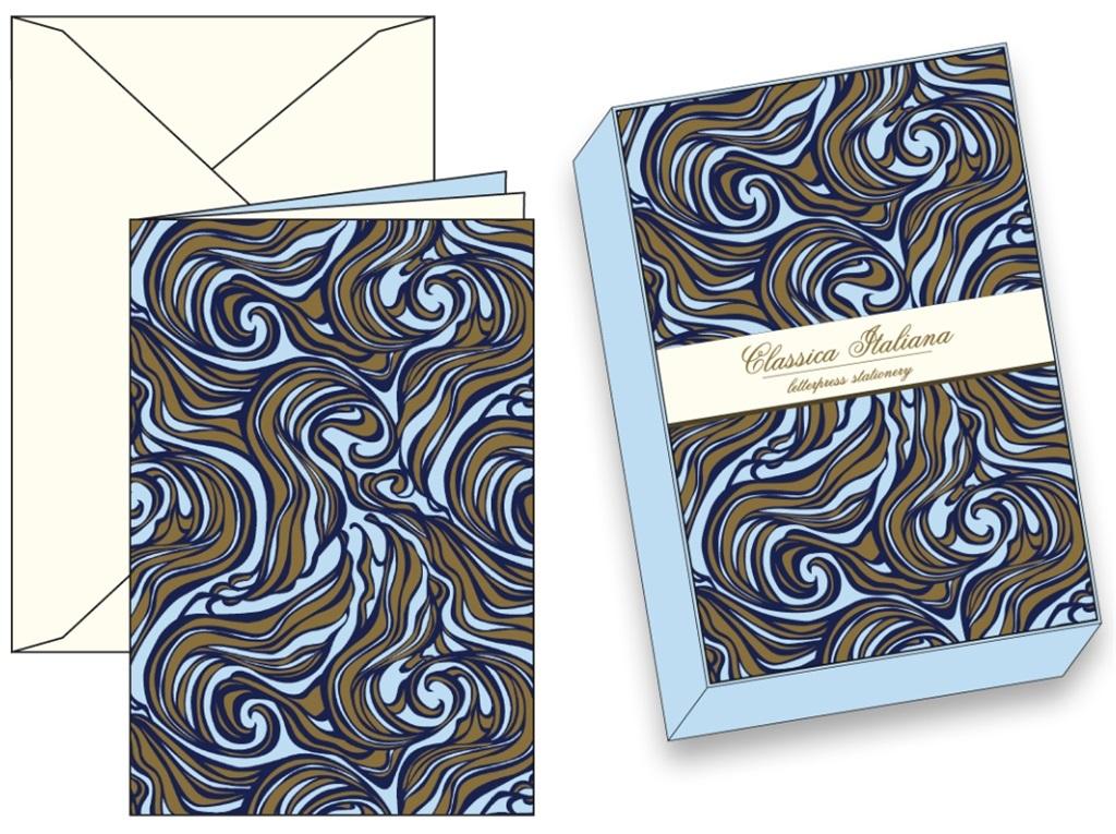 Papeteria w ozdobnym pudełku, papier o gramaturze 250g/m2. W zestawie znajduje się 10 kopert i 10 karnetów.