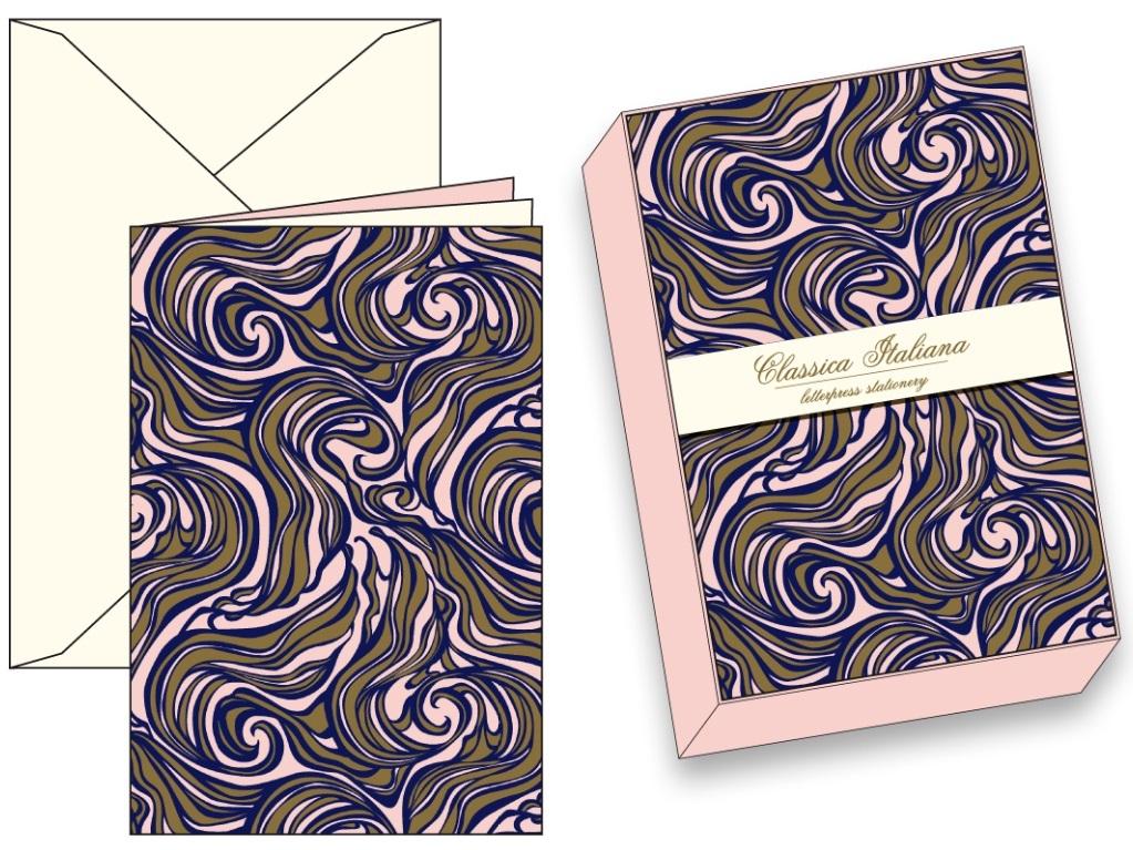 Papeteria w ozdobnym pudełku, papier o gramaturze 250g/m2. W zestawie znajduje się 10 kopert i 10 karnetów.