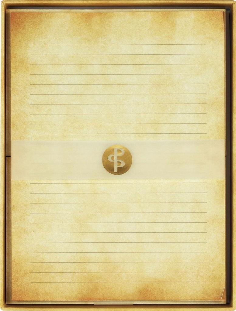 "Klasyczna papeteria z firmy Peter Pauper Press - Vintage (Vintage Parchment). W eleganckim pudełku znajdziemy 30 kartek z dwustronnym barwieniem imitujacy archiwalny papier, z jednej strony dodatkowo zadrukowene w linie oraz 24 koperty dopasowane kolorem. Każda strona po złożeniu na pół idealnie pasuje do koperty.