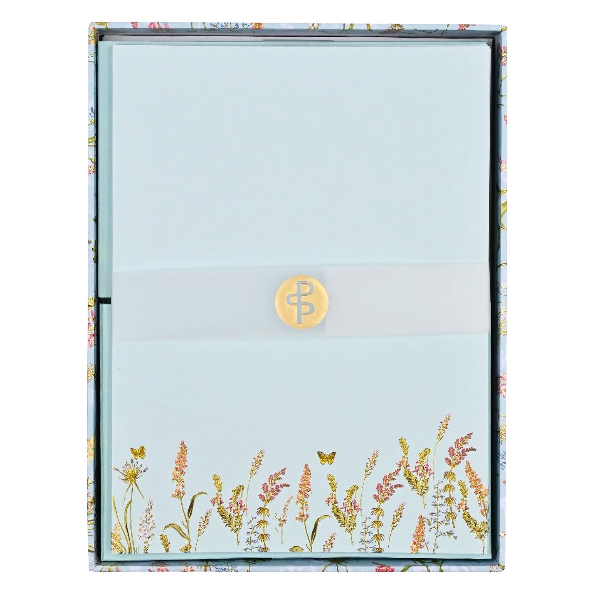 Klasyczna papeteria z firmy Peter Pauper Press - Kwiaty i Motyle (Blooms and Butterflies). W eleganckim pudełku znajdziemy kartki z jednostronnym nadrukiem oraz dopasowane kolorystyczne koperty. Wzory na kartkach są tłoczone, ze zdobieniami w postaci złotej folii. Każda strona po złożeniu na pół idealnie pasuje do koperty.