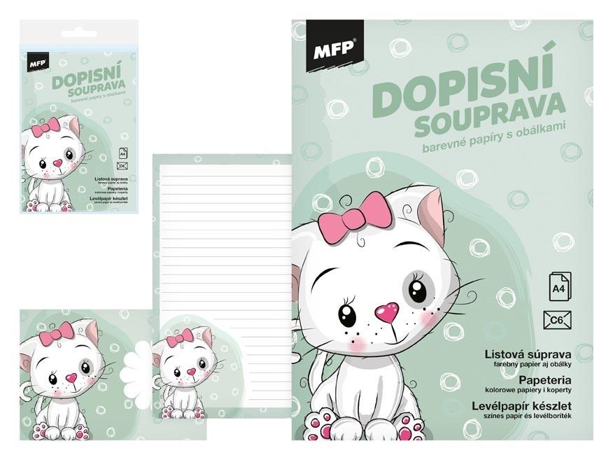 Zestaw papeterii. Zawiera 10 kartek A4 z nadrukiem oraz 5 kopert C6 z nadrukiem. Cały zestaw jest zapakowany w twardą oprawkę z nadrukiem i zafoliowany, posiada również eurozawieszkę.