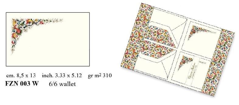 FZN 003W Papeteria Wallet 6 kopert i 6 kartek. Papeteria w opakowaniu typu Wallet, koperty posiadają zaznaczoną linię, papier o gramaturze 310/m2.  Produkt z ekskluzywnej galanterii wyprodukowany we włoskiej manufakturze.