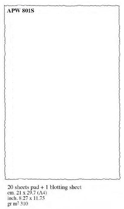 Papier czerpany w kolorze białym, format A4 z podkładką 20 arkuszy. Gramatura papieru 310g/m2. Wyprodukowano we Włoszech.