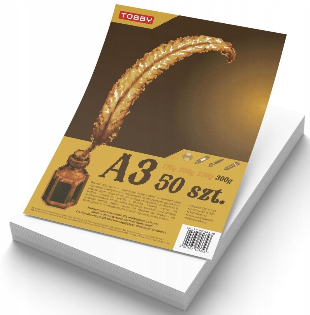 Papier techniczny brystol gruby 300g A3 50 ark. do farb markerów ołówka Papier brystol 300 g/m2 A3 - 50 ark. Ilośc arkuszy: 50 ark. Gramatura: 300 g/m2 Kolor: biały Struktura: techniczny Format: A3 (420 x 297 mm) Biały papier techniczny A3 Najwyższej klasy papier o maksymalnej sztywności, dedykowany najbardziej wymagającym projektom artystycznym. Jego struktura doskonale współpracuje z grubymi farbami, pastelami, markerami, kredkami i ołówkiem. Idealny wybór dla profesjonalistów, którzy cenią elegancję, trwałość i wyrazistość każdego detalu. Najważniejsze cechy Wysoka jakość powierzchni - szorstkość 225% oznacza optymalną przyczepność dla ołówka, cienkopisów i kredek, dzięki czemu rysowanie jest płynne i precyzyjne. Papier bezdrzewny - wykonany z oczyszczonej celulozy, charakteryzuje się trwałością i odpornością na żółknięcie. Idealny do archiwizacji, szkiców oraz projektów, które mają przetrwać lata. Wysoka gładkość - idealna pod wydruki o wysokiej rozdzielczości oraz techniki suche, zapewnia estetyczny wygląd i czyste linie. Niepowlekany - naturalna struktura papieru bez chemicznych powłok sprawia, że jest przyjazny dla środowiska i doskonale przyjmuje różne media rysunkowe. Nadaje się również do druku Nasz papier techniczny jest idealny do codziennych zastosowań - drukowania i kserowania Gwarantuje czyste i precyzyjne wydruki Doskonały wybór dla tych, którzy poszukują niezawodności i wyrazistości w codziennym użytkowaniu