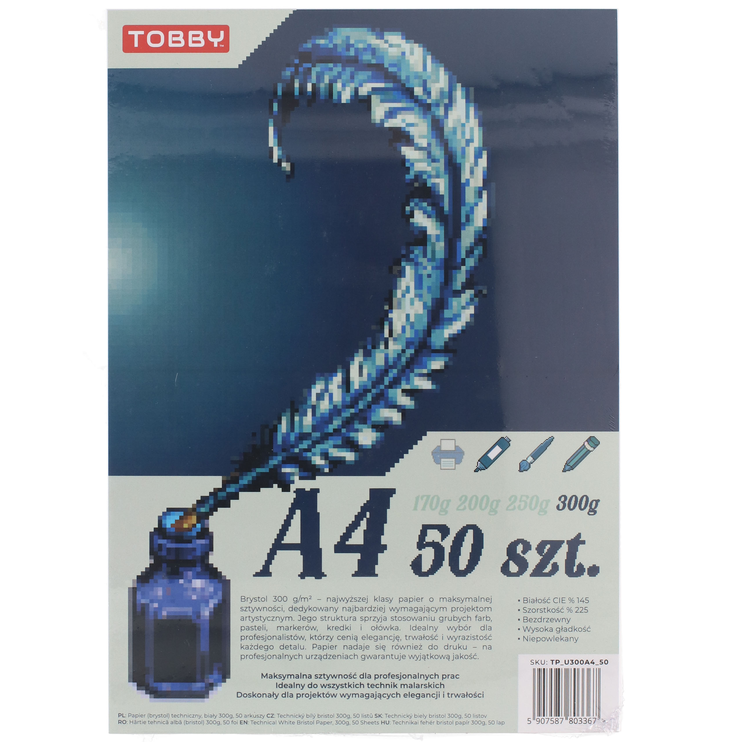 Papier techniczny brystol gruby 300g A4 50 ark. do farb markerów ołówka Papier brystol 300 g/m2 A4 - 50 ark. Ilośc arkuszy: 50 ark. Gramatura: 300 g/m2 Kolor: biały Struktura: techniczny Format: A4 (210 x 297 mm) Biały papier techniczny A4 Najwyższej klasy papier o maksymalnej sztywności, dedykowany najbardziej wymagającym projektom artystycznym. Jego struktura doskonale współpracuje z grubymi farbami, pastelami, markerami, kredkami i ołówkiem. Idealny wybór dla profesjonalistów, którzy cenią elegancję, trwałość i wyrazistość każdego detalu. Najważniejsze cechy Wysoka jakość powierzchni - szorstkość 225% oznacza optymalną przyczepność dla ołówka, cienkopisów i kredek, dzięki czemu rysowanie jest płynne i precyzyjne. Papier bezdrzewny - wykonany z oczyszczonej celulozy, charakteryzuje się trwałością i odpornością na żółknięcie. Idealny do archiwizacji, szkiców oraz projektów, które mają przetrwać lata. Wysoka gładkość - idealna pod wydruki o wysokiej rozdzielczości oraz techniki suche, zapewnia estetyczny wygląd i czyste linie. Niepowlekany - naturalna struktura papieru bez chemicznych powłok sprawia, że jest przyjazny dla środowiska i doskonale przyjmuje różne media rysunkowe. Nadaje się również do druku Nasz papier techniczny jest idealny do codziennych zastosowań - drukowania i kserowania Gwarantuje czyste i precyzyjne wydruki Doskonały wybór dla tych, którzy poszukują niezawodności i wyrazistości w codziennym użytkowaniu