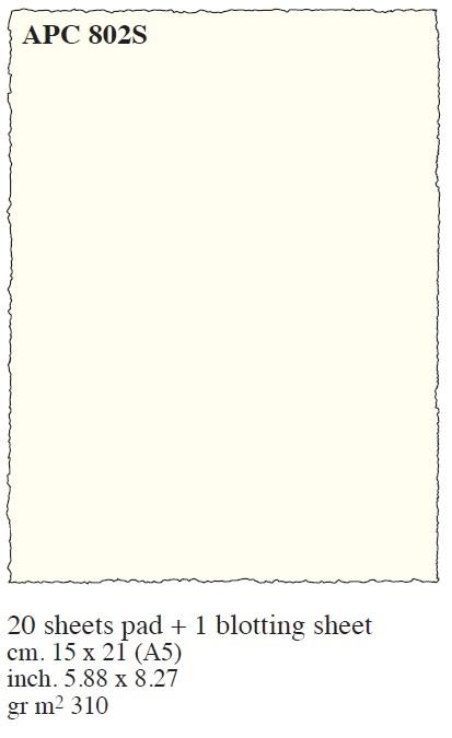 Papier czerpany w kolorze kremowym, format A5 z podkładką 20 arkuszy. Gramatura papieru 310g/m2. Wyprodukowano we Włoszech.