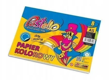 Papier kolorowy błyszczący SAMOPRZYLEPNY, format A5, 8 kartek, kolory intensywne w tym złoty i srebrny. Idealny do prac kreatywnych, do rysowania, wycinanek i wydzieranek. Idealny do zajęć w szkole i przedszkolu.