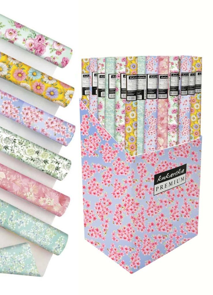 Papier ozdobny premium całoroczny - kwiatowy. To papier do pakowania prezentów z metalizowaną folią. Rozmiar: 70 x 200 cm Gramatura: 80 g Ilość wzorów: 6 Ilość rolek w displayu: 48 (po 8 rolek z każdego wzoru)