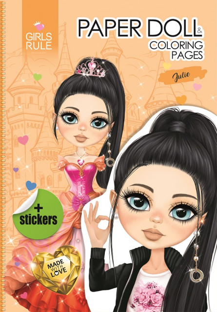Papierowa lalka do zabawy - Julie. W środku znajdziesz wiele różnych strojów, w które możesz ją przebrać. Pokoloruj ją, a następnie wytnij z książeczki, potem ubierz - zaginając specjalnie zaznaczone krawędzie. Stroje mają wyraźne oznaczenia pokazujące, gdzie wyciąć, aby ubrania pasowały na lalkę. Wykorzystaj także naklejki, które znajdziesz w środku. Baw się opowiadając najróżniejsze historie. Możesz przebrać lalkę i zacząć zabawę od nowa.