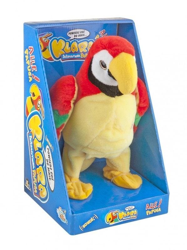 Papuga Klara 27 cm to zabawka interaktywna, nagrywająca i powtarzająca zdania. Kołysze się zabawnie na nóżkach. Papuga ma mięciutkie futerko, może być wykorzystana jako przytulanka. Zabawka zawiera baterie.