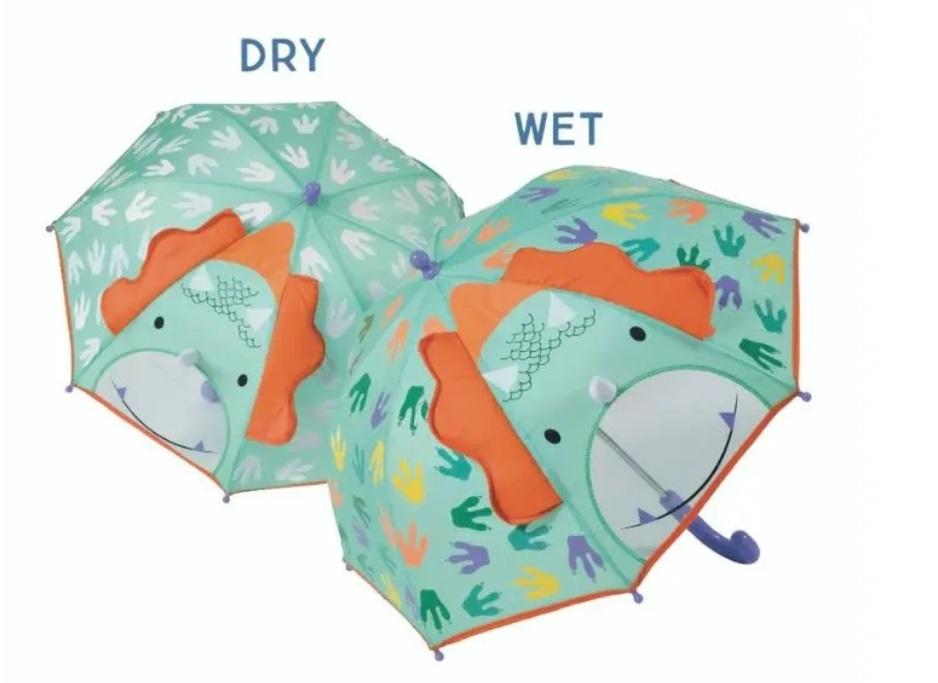 Niezwykła parasolka zmieniająca kolory, wyposażona w zabawne elementy 3D i okienko do wyglądania. Zmieniające się kolory parasolki sprawią, że dzieci będą uwielbiały spacery na deszczu. Czasza parasolki przedstawia uśmiechniętego dinozaura, którego buźka tworzy okienko pozwalające oglądać świat. W komplecie znajduje się wygodne zapięcie na rzep do zabezpieczenia złożonej parasolki. Cechy: