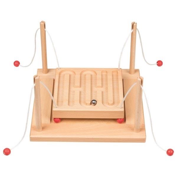Zręcznościowe gry dla dzieci Goki pomagają rozwijać koordynację ruchową oraz motorykę, ale jednocześnie wskazują, czym jest prawdziwa kooperacja. Już najmłodsi uczą się podstawowych zasad współpracy, przedstawiania innym swoich pomysłów, a także rozumienia się bez słów w grupie rówieśników. W zestawie znajduje się drewniana podstawka z filarami, dwustronna plansza z 4 linkami i kulka, którą należy przeprowadzić przez labirynty. W zabawie może uczestniczyć od 2 do 4 osób. Poprzez odpowiednie naciąganie sznurków przechyla się powierzchnię toru by ostrożnie dotrzeć do jego końca.