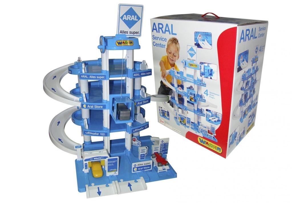 Parking ARAL 4-POZIOMOWY wyposażony jest w myjnię z obracającymi sie gąbkami, warsztat samochodowy z podnośnikiem, winda transportującą samochody na wszystkie cztery poziomy oraz mini stację benzynową. Dodatkowym atutem są zawarte w komplecie trzy samochody oraz komplet naklejek.