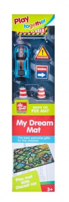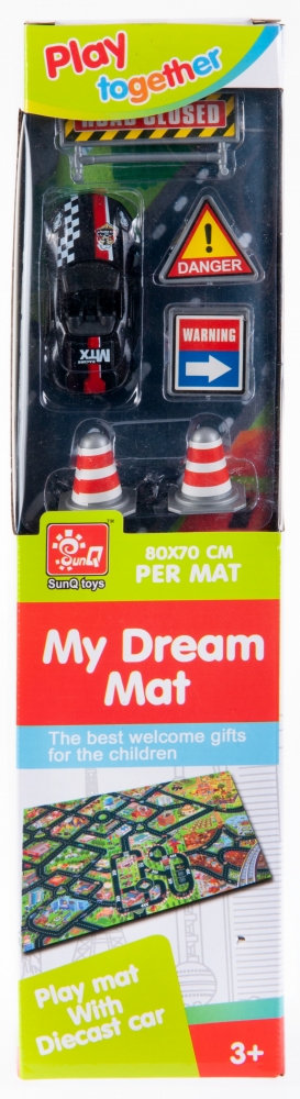 Zawartość zestawu: 1 x mata materiałowa, samochód, znaki drogowe.