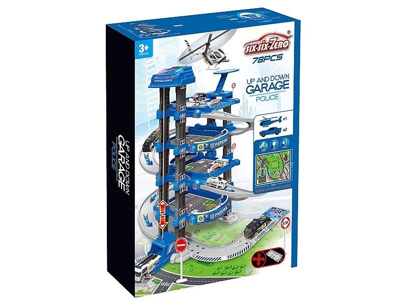 Parking policyjny, wielopiętrowy, z windą, 78 części, wym.rozłożonego 67x60x32cm, światło, dźwięk, pojazdy; 50,5x37,5x8,5cm