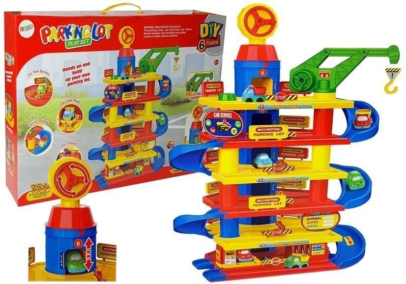 Parking poziomowy 6 poziomowy 78 elem. Mali chłopcy uwielbiają bawić się samochodami, naprawiać, myć na myjni. Uwielbiają o nie dbać. My proponujemy parking, które da im to wszystko. Parking posiada dużo funkcji, które urozmaicą zabawę, pobudzą wyobraźnie i na pewno zajmą twoją pociechę na wiele godzin. Przyjazna kolorystyką i autka z buźkami wyglądają przyjaźnie i zachęcają malucha. Bogate kolory rozwijają percepcję wzrokową. Zaletą naszego zestawu jest to że sam może nauczyć się zbudować taki parking, co na pewno rozwinie jego zdolności manualne, rozwinie logiczne myślenie, spostrzegawczość oraz poprawi jego funkcję ręki podczas składania. Opcje parkingu: - mobilna winda - myjnia samochodowa - stacja paliw -warsztat samochodowy - mobilny żuraw - parking - zjeżdżalnia do autka - ruchome bramy - dwa samochody w zestawie - naklejki dekoracyjne - instrukcja w języku angielskim Wymiary elementów zestawu: parking: 57 cm x 39 cm x 84 cm samochody: ok. 7 cm x 6 cm x 5 cm helikopter: ok. 8 cm x 4,5 cm x 6 cm Wymiary opakowania: 47 cm x 14, 5 cm x 68 cm Zabawka przeznaczona dla dzieci powyżej 3 roku życia. Wykonana z bezpiecznego materiału.