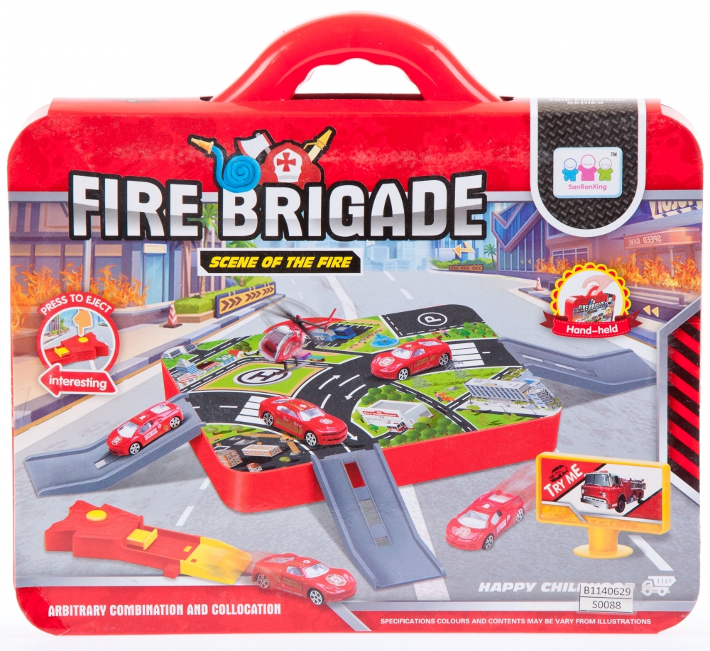 Zawartość zestawu : 1 x parking jednopoziomowy,1 x walizka do przechowywania całości zestawu, 1 x samochód strażacki mały,1 x plansza-plan parkingu, 3 x tor umożliwiający wjazd/wyjazd z parkingu, 1x sterownik do napędzania samochodów, 1 x bilbord z opisem parkingu.