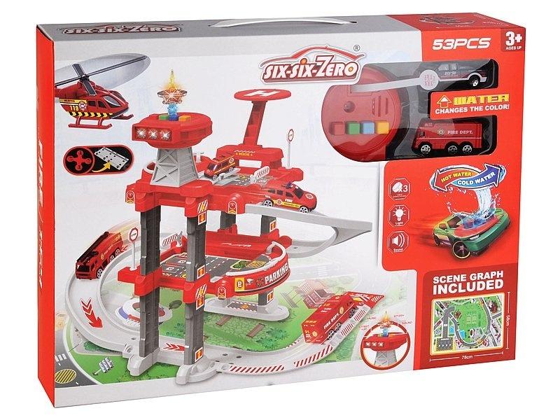 parking 2 poziomowy straży pożarnej, wym.rozłożonego 60x44x28cm, 2 auta zmieniające kolor pod wpływem wody, śwuatło, dźwięk; 46x35x8cm, W/B