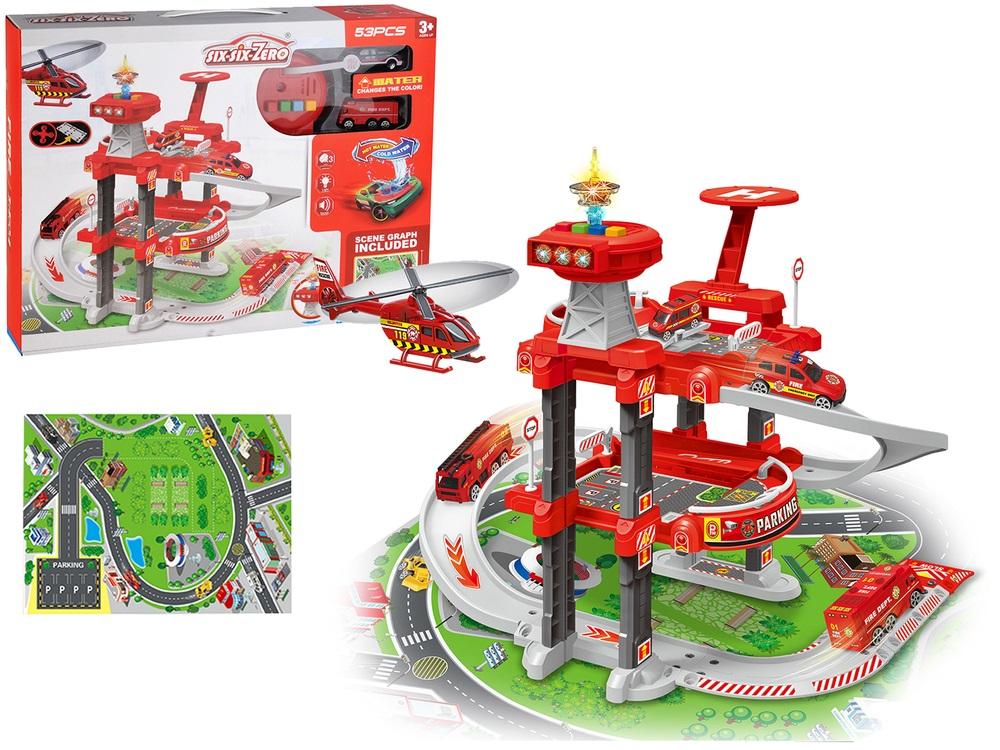 Parking Straż Pożarna Dwupoziomowy Autka Akcesoria Dźwięki Maluchy uwielbiają zabawki wielofunkcyjne, które pozwolą dać upust ich wyobraźni i dają wiele możliwości. Dlatego zabawa szybko się nie znudzi. Stwórz własną bazę straży pożarnej, z profesjonalnym lądowiskiem dla helikopterów i parkingami. Składanie całego parkingu rozwinie zdolności manualne, precyzje oraz kreatywności. Sama zabawa pobudzi jego wyobraźnie i pozwoli tworzyć najróżniejsze scenariusze zabaw. Czas na super zabawę ! Zestaw składa się z 53 elementów, co stanowi wyzwanie do ułożenia takiego parkingu. Poza tym w zestawie znajdują się 2 autka straży pożarnej. Cztery przyciski windy odpowiadają za sygnały alarmowe i świetlne. Autka zmieniają kolor pod wpływem wody i temperatury. Super połączenie. Mata dołączona do zestawu pozwoli stworzyć pełne atrakcji miasto. Wszystkie elementy są wyprodukowane z najwyższej jakości plastiku, dlatego zabawka jest trwała. Nie posiada również ostrych zakończeń. Elementy zestawu: -parking - 2 autka straży pożarnej - elementy do montażu parkingu - mata okolicy - zestaw naklejek Wymiary elementów zestawu: -parking: 47 cm x 38 cm x 45 cm -autka: 7 cm x 3 cm x 3 cm - mata: 78 cm x 58 cm Wymiary opakowania: 47 cm x 36 cm x 9 cm Zabawka przeznaczona dla dzieci powyżej 3 roku życia. Wykonana z bezpiecznego materiału. Parking zasilany jest trzema bateriami 1,5 V AA, brak w zestawie.