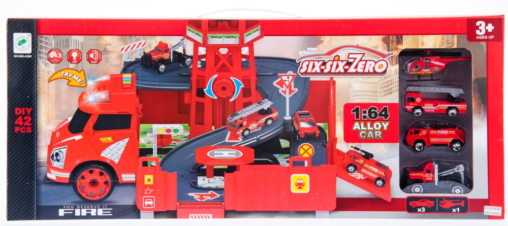 Zawartość zestawu: samochód ciężarowy z rozkładanym parkingiem, 3 samochody strażackie, 1 helikopter, znaki oraz sygnalizacja drogowa.