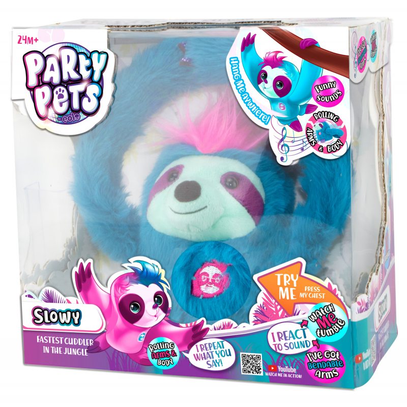 Spróbuj złapać pełzającego leniwca! Party Pets Sloth obraca się z wygiętymi rękami i jednocześnie się śmieje. Naciśnij leniwą masę, a wyda zabawne dźwięki. Leniwy również reaguje na głos i mowę, powtarzając je.