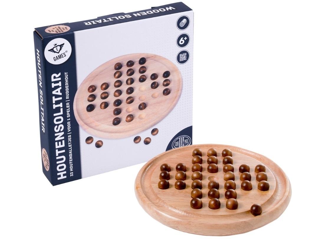 Pasjans z drewna kauczukowego z 33 drewnianymi kulkami. Przedmiot jest dostarczany w kolorowym pudełku. Średnica: 23 cm.
