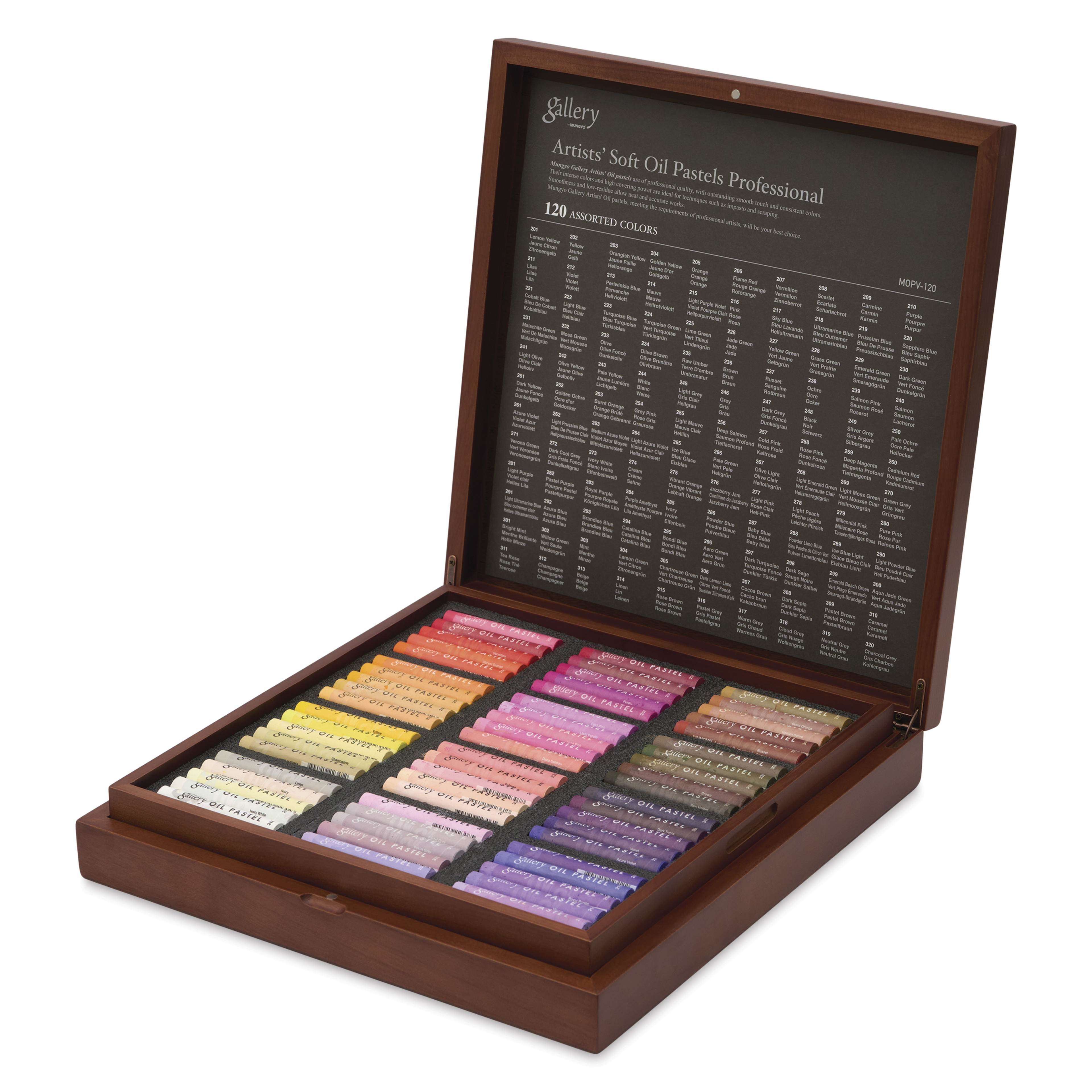 Zestaw zawiera 120 sztuk pasteli olejnych. Kolory: 201 Cytrynowożółty, 204 Złocistożółty, 207 Cynobrowy, 259 Głęboka magenta, 257 Złoty róż, 256 Głęboki łososiowy, 261 Fioletowy lazurowy, 213 Barwinek, 255 Jasny malachit, 263 Średni fioletowy lazur, 262 Pruski błękit, 222 Jasnoniebieski, 231 Zieleń malachitowa, 269 Jasna zieleń mchu, 228 Zieleń trawiasta, 226 Zieleń jadeitowa, 225 Zieleń limonkowa, 241 Jasna oliwka, 234 Brąz oliwkowy, 237 Rdzawy, 252 Złota ochra, 244 Biały, 251 Ciemnożółty, 270 Zielonoszary, 247 Ciemnoszary, 279 Róż milenijny, 277 Jasnoróżowy, 307 Brąz kakaowy, 292 Błękitny lazurowy, 295 Niebieski Bondi, 291 Jasny Ultramaryna, 288 Limonkowy błękit w proszku, 305 Zieleń chartreuse, 275 Jaskrawa pomarańcza, 308 Ciemna sepia, 313 Beż, 318 Szarość chmur, 321 Żółć fluorescencyjna, 324 Różowy fluorescencyjny, 327 Metaliczna biel, 330 Złoty, 202 Żółty, 205 Pomarańczowy, 208 Szkarłatny, 210 Fioletowy, 260 Czerwony kadmowy, 239 Łososiowy róż, 211 Liliowy, 214 Malwowy, 264 Jasny lazurowy fiolet, 218 Ultramaryna, 262 Jasny błękit pruski, 223 Turkusowy błękit, 230 Ciemna zieleń, 268 Jasna szmaragdowa zieleń, 227 Żółta zieleń, 266 Jasna zieleń, 232 Zieleń mchu, 235 Surowa umbra, 253 Spalona pomarańcza, 254 Szary róż, 249 Srebrnoszary, 245 Jasnoszary, 271 Zieleń Verona, 248 Czarny, 281 Jasnofioletowy, 283 Fiolet królewski, 294 Niebieski Catalina, 297 Ciemny turkus, 299 Jasna szmaragdowa zieleń, 290 Jasnoniebieski, 302 Zieleń wierzbowa, 306 Ciemna cytrynowo-limonkowa, 276 Dżem z jagód jazzowych, 309 Brąz pastelowy, 315 Brąz różany, 319 Szary neutralny, 322 Pomarańczowy fluorescencyjny, 325 Zieleń fluorescencyjna szmaragdowa, 328 Żółty metaliczny, 331 Łososiowy metaliczny, 203 Żółty pomarańczowy, 206 Czerwony płomienisty, 209 Karminowy, 258 Różowy różany, 216 Różowy, 240 Łososiowy, 201 Fioletowy, 215 Fioletowo-fioletowy jasny, 217 Błękitny, 220 Niebieski szafirowy, 221 Kobaltowy błękit, 265 Lodowy błękit, 229 Szmaragdowa zieleń, 224 Turkusowa zieleń, 267 Jasna oliwka, 242 Oliwkowa żółć, 233 Oliwkowy, 236 Brązowy, 238 Ochra, 243 Jasnożółty, 250 Jasna ochra, 254 Szaroróżowy, 272 Ciemnoszary, 282 Pastelowy fiolet, 284 Fioletowy ametyst, 293 Niebieski brandy, 300 Jadeitowa zieleń, 303 Mięta, 304 Cytrynowy zielony, 298 Ciemna szałwia, 310 Karmelowy, 312 Szampański, 316 Pastelowa szarość, 320 Szary grafitowy, 323 Fluorescencyjny czerwony róż, 326 Fluorescencyjny błękitny, 329 Jasne złoto, 332 Srebrny.