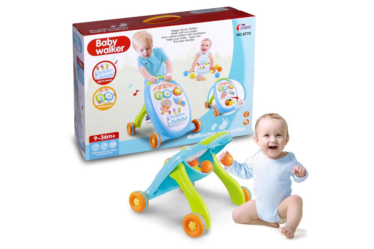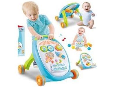 Funkcje: dźwięki, światło, bezpieczna kółka z regulowaną prędkością, ruchome elementy, 4 wyjmowane elementy, pojemnik na piłki.