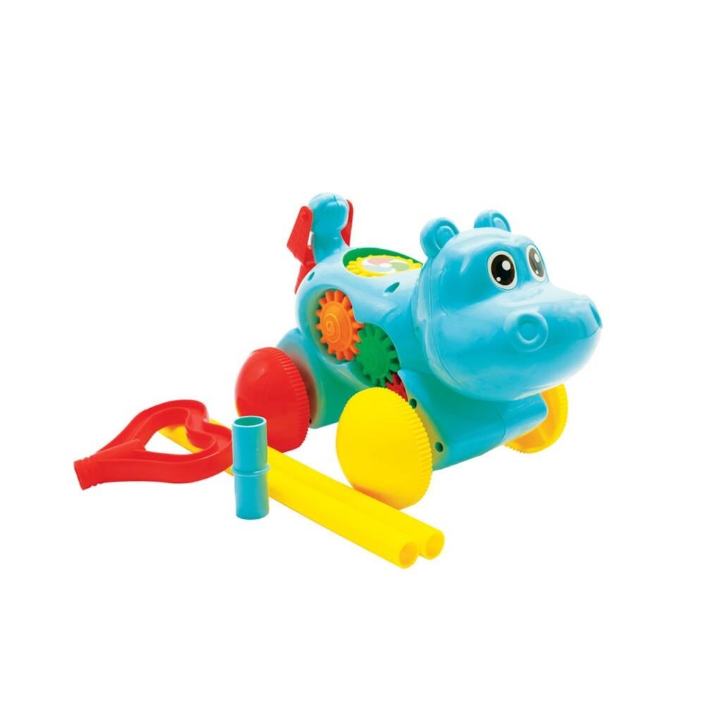W zestawie znajdują się 2 rurki, uchwyt, złączka do rurek. Hipcio podczas pchania wydobywa dźwięk. Nie wymaga użycia baterii. Pchacz hipcio przeznaczony jest dla dzieci powyżej 3 roku życia.