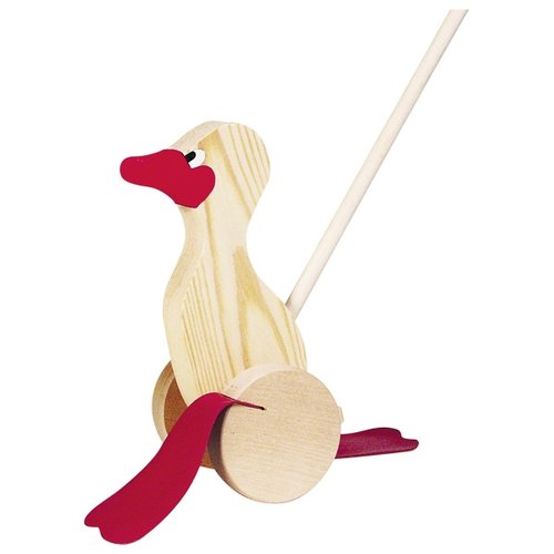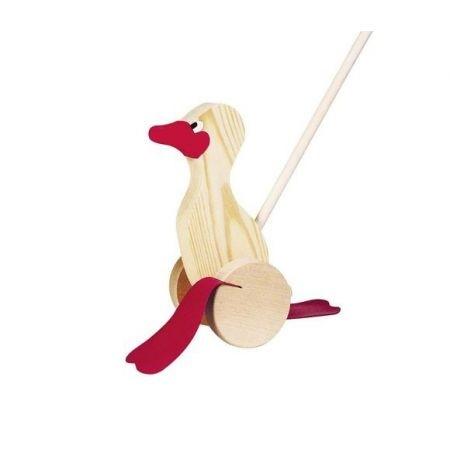 Drewniana zabawka - zwierzątko do pchania. Zabawka rozwija koordynację ruchową, uczy rozpoznawania zwierząt i kolorów. Największą radość sprawia dzieciom pomiędzy 1. a 2. rokiem życia. Długość kijka: 60 cm Wysokość zabawki: 21 cm