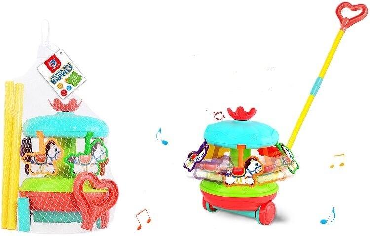 W zestawie: pchacz karuzela- wys. 20 cm, 2 drążki z łącznikiem i rączką 52 cm, funkcje: w czasie pchania kolorowe koniki na karuzeli obracają się wydając charakterystyczny dźwięk, 3+