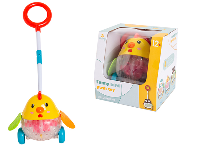 Podczas pchania kurczak rusza skrzydełkami i migoczą kolorowe światełka.