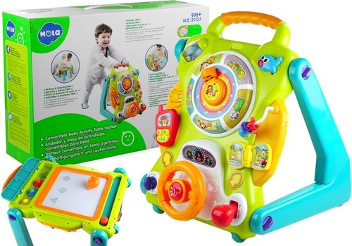 Pchacz edukacyjny 3 w 1 Prezentowany pchacz jest zabawką, która kryje w sobie mnóstwo funkcji. Prezentowany model może stanowić interaktywne centrum zabaw, które pomaga w rozwoju — nauce pierwszych liter, cyfr, słów czy kształtów. Barwny pchacz wyposażony jest w przeróżne elementy dźwiękowe, a także umożliwiające działania —kręcenie, naciskanie, obracanie. Zabawa z wykorzystaniem prezentowanego chodzika będzie ogromną pomocą dla maluszka, który jest ciekawy otaczającego go świata. Uważamy, że zestaw ten jest rewelacyjną zabawką zarówno dla dzieci raczkujących, jak i tych stawiających swe pierwsze kroki. Sprawi również dużo radości maluchom, które bawią się na siedząco — wspomagając ich rozwój i przyśpieszając naukę samodzielności. Na kolorowym panelu umieszczono szereg rewelacyjnych zabawek, między innymi: - odczepiany telefon z przyciskami, - obrotową kierownicę sprawiająca, że pomarańczowe autko jeździ w koło po swoim torze, - kluczyk w stacyjce, aktywujący dwa różne dźwięki po przekręceniu, - dźwignię biegów z dźwiękami, - grającą książeczkę z przekładanymi stronami, - obracany walec z grzechocącymi kuleczkami, - przesuwany samolocik, - pięć świecących przycisków, które wydają dźwięki charakterystyczne dla elementów umieszczonych na obrazku. Edukacyjna zabawka zainteresuje każdemu malucha odgłosami aut, wesołego śmiechu dzieci, a także kolorowymi światełkami. Co ciekawe, jest bardzo uniwersalna i funkcjonalna, może być pchaczem dla dzieci powyżej 9. miesiąca życia, który w bezpieczny i prosty sposób pomaga siadać, wstawać i stawiać pierwsze kroki, panelem edukacyjnym dla dzieci powyżej 1. roku życia, który usprawni koordynację dziecka, a także rozwinie jego umiejętności motoryczne, a także stolikiem do rysowania i pisania dla dzieci, które osiągnęły 1,5 roku życia — wystarczy zmienić konstrukcję pchacza, w efekcie czego powstanie świetny stolik ze znikopisem. Tuż nad nim znajduje się specjalny otwór, w którym umieszczono rysik i trzy stempelki - kółko, kwadrat i trójkąt. Prezentowany pchacz przeznaczony jest dla wszystkich dzieci powyżej 9. miesiąca życia. By móc korzystać ze wszystkich jego funkcji, należny zasilić go 3 sztukami baterii AA 1,5 V. Zabawka zapakowana jest w barwne pudełko, dzięki czemu rewelacyjnie nadaje się na prezent dla świeżo upieczonych rodziców. Pchacz został wykonany z bezpiecznych, atestowanych materiałów najwyższej jakości, posiada certyfikat CE. Wymiary złożonego pchacza: - 37 cm x 40,5 cm x 39 cm. Wymiary opakowania: - 47,5 cm x 33,5 cm x 15,5 cm.