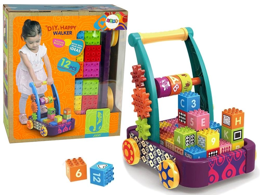 Pchacz Kolorowe Klocki 2 w 1 Wózek Litery Kolorowy zestaw 2 w 1 - pchacz i klocki to idealny zestaw edukacyjny Twojego dziecka. Dziecko pobudza logiczne myślenie, kreatywność oraz wyobraźnie. Czas na super zabawę ! Produkt został wykonany z wysokiej jakości plastiku, całkowicie bezpiecznych dla dziecka. Konstrukcja wózka zapobiega upadkom. Gumowy pasek na tylnych kołach zapobiega ślizganiu się wózka na śliskich powierzchniach. Klocki mają bardzo duży wymiar, dzięki czemu łatwiej chwytać i układać z nich wieże. Na dnie znajduje się plastikowa podkładka, do niej dziecko może wpinać kolorowe klocki. Zabawka może także pełnić funkcje wózka, przewozić rzeczy z miejsca na miejsce. Zabawka świetnie sprawdzi się podczas zabawy w domu lub w ogrodzie. Cechy zabawki: - kolorowe klocki wraz z różnymi wzorami stymulują wzrok Twojego dziecka. - trzy koła zębate różnej wielkości pozwalają rozwinąć zdolności manualne i precyzje. - klocki o różnej fakturze stymulują zmysł dotyku - pchacz umożliwia maluchowi swobodne poruszanie i naukę chodzenia - po środku znajduje się drążek z trzema obracanymi klockami. Na nich znajdują się rożne obrazki, literki. Pierwsze skojarzenia i nauka rozpoczęta! W skład zestawu wchodzi: - pchacz z rączką - 12 różnych klocków Wymiar pchacza: 37 cm x 26 cm x 40 cm Wymiary klocka: 5 cm x 5 cm x 5 cm Wysokość pchacza: 40 cm Średnica kółek: 8,5 cm Wymiary opakowania: 34 cm x 38 cm x 15,5 cm Zabawka przeznaczona dla dzieci powyżej 3 roku życia. Zgodna z certyfikatem CE i normą EN71.