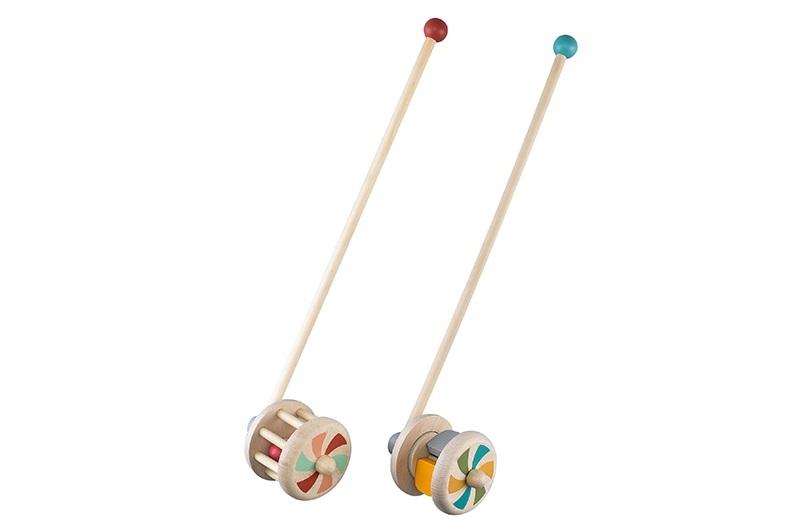 Wzór nr 1 posiada: drewniane szczebelki, 4 kolorowe kulki, Wzór nr 2 posiada: 5 kolorowych klocków stukających o siebie podczas obrotu. Wym. pchanki: 13,5 x 56 x 9 cm.