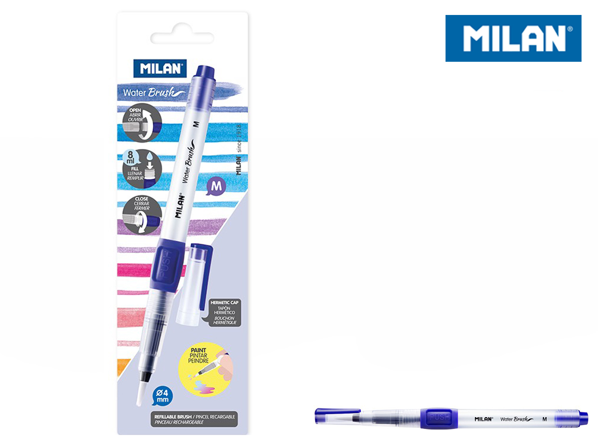 Pędzel wodny ze zbiorniczkiem na wodę 8 ml. Niezastąpiony przy pracy z farbami akwarelowymi, kredkami akwarelowymi, ołówkami i pastelami. Można stosować w użyciu z wodą ale także z tuszami i niemal wszystkimi rodzajami farb płynnych. Gumowy przycisk ułatwia i reguluje dawkowanie płynu. Końcówka z włosia syntetycznego o średnica 4 mm. Rozmiar pędzla: 13,5 x O 1,7 cm.