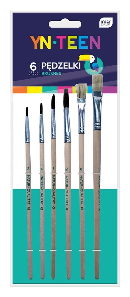 Zestaw 6 drewnianych pędzelków o różnych szerokościach i kształtach końcówek.