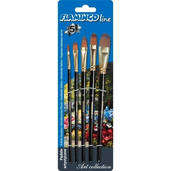 Zestaw 5 pędzli artystycznych z włosiem syntetycznym. Idealnie nadają się do bardzo precyzyjnego malowania. Gwarantują niezwykłą precyzję przydatną przy kreowaniu wszelkiego rodzaju niewielkich detali i wykończeń. Idealne do zastosowań szkolnych, domowych oraz dla artystów na każdym poziomie zaawansowania. Doskonale nadają się do farb olejnych, akrylowych, akwarelowych, gwaszy oraz farb do tkanin. Sprawdzą się również doskonale w technice decoupage podczas wykonywania drobnych detali. Wytrzymałe drewniane uchwyty z oznaczeniem grubości pędzla. Rodzaj końcówki: płaska zaokrąglona. NR: 2,6,8,10,12 . Pakowane na blistrze po 5 sztuk