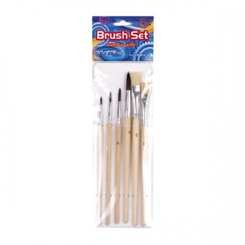 Zestaw 6 pędzli o końcówkach ,,w szpic"" i płaskich, z włosia naturalnego. Umożliwiają uzyskanie różnorodnych efektów malarskich. Posiadają znak CE.