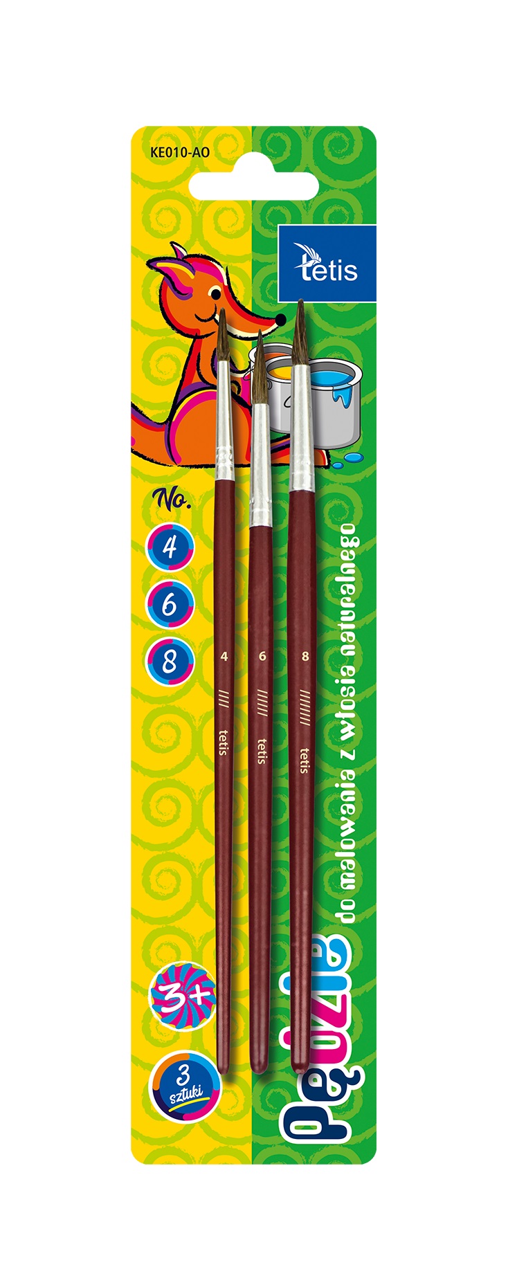 Pędzle do malowania z naturalnego, miękkiego włosia. Okrągły kształt. Lakierowana rączka z drewna brzozowego. Opakowanie: display 3 sztuki (dostępne w rozmiarach: 4, 6, 8 (KE010-AO), 8, 10, 12 (KE010-BO)).
