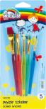 Zestaw 5 pędzelków w krótkich, kolorowych uchwytach z przezroczystego plastiku. Nylonowe włosie w kolorze uchwytu. Do różnych technik malarskich. Poręczne, mieszczą się w każdym tornistrze. 5 różnych fasonów włosia. Płaskie: szeroki, wąski, ścięty. Okrągłe: średni, wąski.