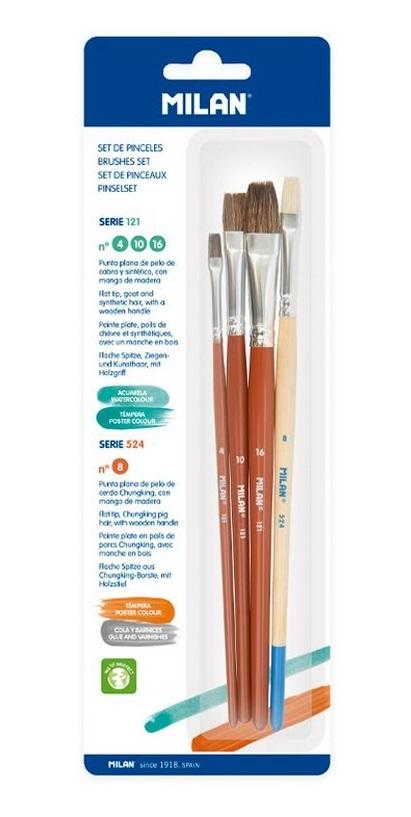 Zestaw 4 szt. pędzli szkolny płaskich z serii 121 nr 4, 10 i 16 oraz nr 8 z serii 524. Seria 121: Pędzle z krótkim drewnianym trzonkiem. Skład: 70% naturalnego włosia koziego + 30% syntetyczne. Brązowe lakierowane wykończenie i aluminiowa skuwka bez spawania, odporna na rdzewienie. Bardzo miękkie włosie idealne do technik akwarelowych, wodnych i plakatowych. Lepsze zatrzymanie wody i farby. Gładsza linia. Lepsza odporność i elastyczność, co ułatwia odzyskanie kształtu po jego użyciu. 524: Pędzel ze szczeciny Chungking o wysokiej odporności i trwałości. Nadaje się do kleju, lakierów, tempery i gęstej farby. Ergonomiczny krótki drewniany trzonek polakierowany w kolorze naturalnego drewna sosnowego.