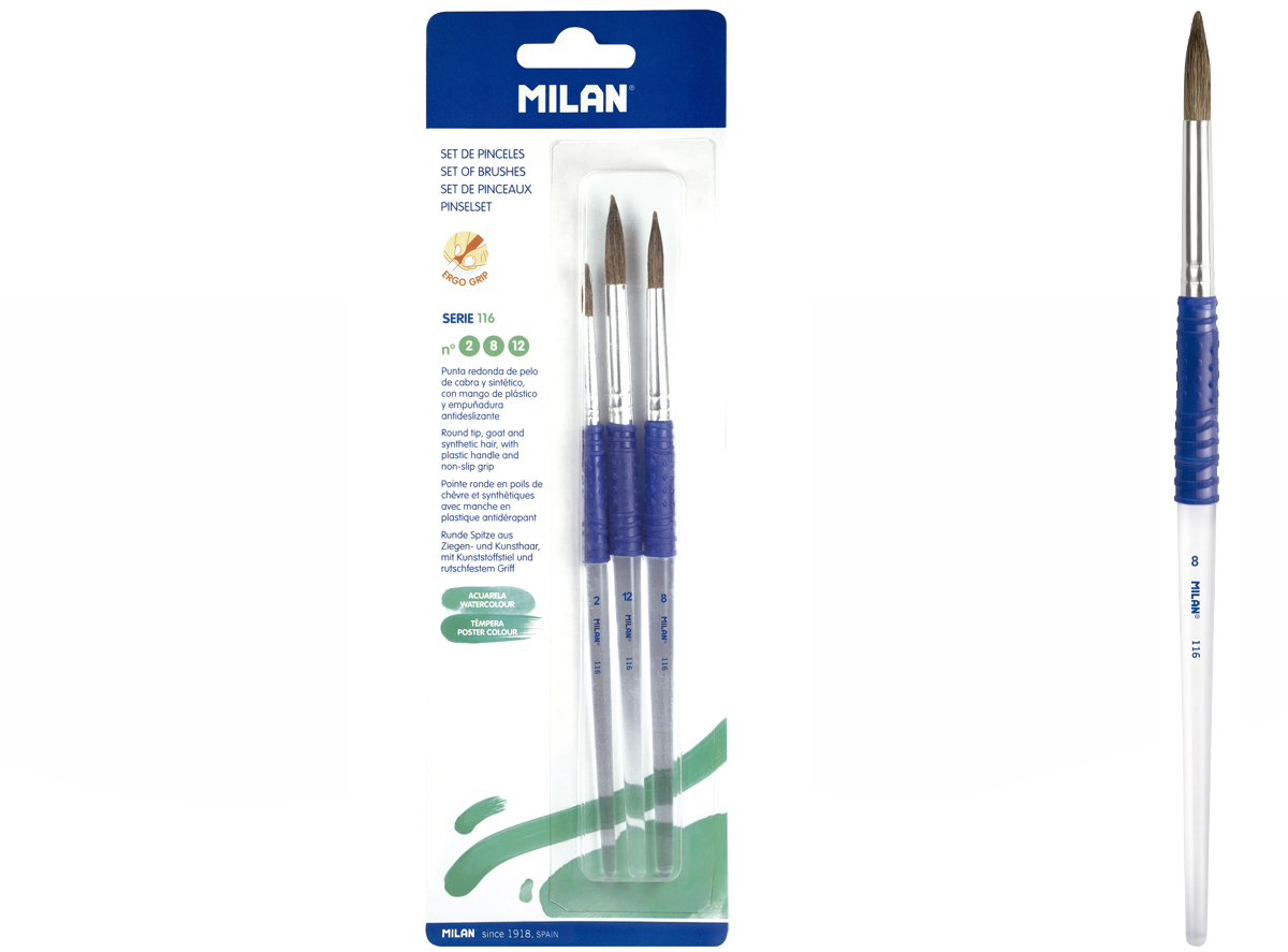 Opakowanie Pędzle okrągłe z włosia koziego Milan seria 116 3 sztuki na blistrze