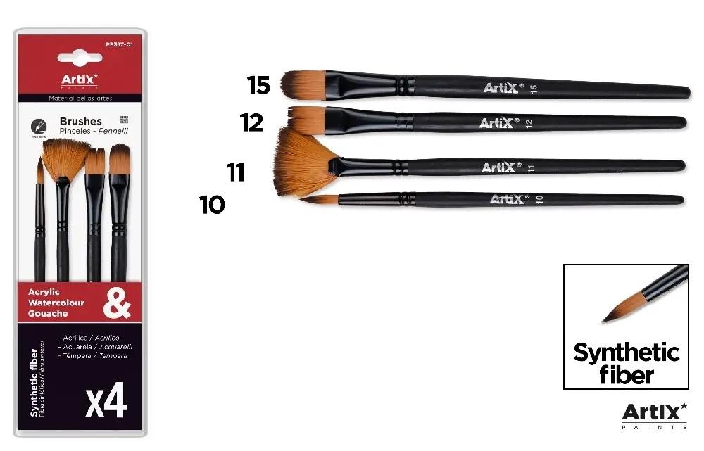 Profesjonalny pędzel do malowania z bardzo miękkiego włosia syntetycznego. Idealny do farb temperowych,olejnych lub akrylowych. Drewniany korpus lakierowany na czarno. Długość: 20,5 cm. Blister zawierający 4 sztuki: trzy z płaskimi skuwkami(1 koci język nr 15, 1 płaski nr 12 i jeden płaski wentylator) oraz 1 okrągła skuwka nr 10.