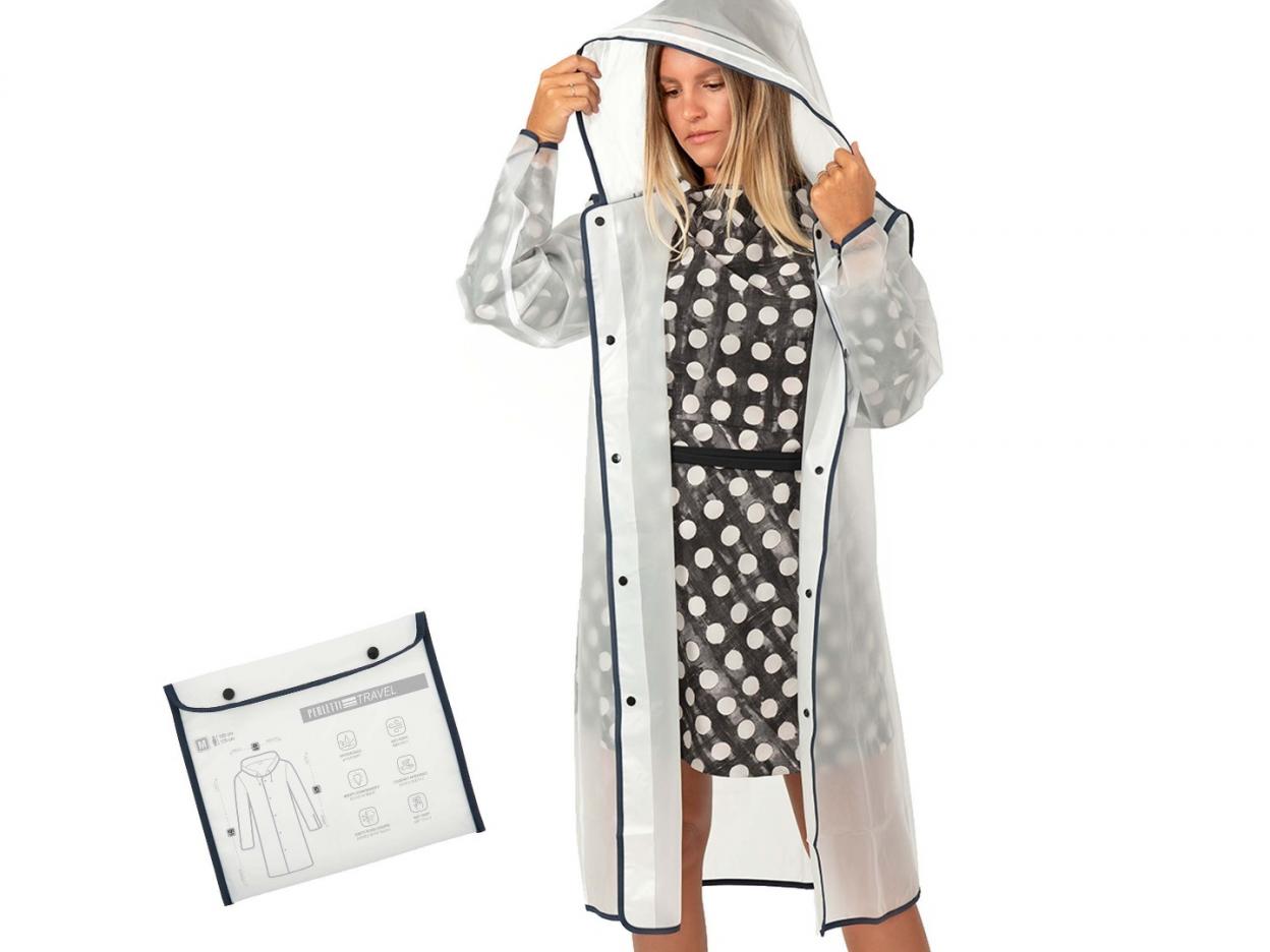 Peleryna przeciwdeszczowa transparentna (przeźroczysta) - praktyczna i nowoczesna ochrona przed deszczem, idealna na spacery, podróże czy codzienne dojazdy. Wykonana z wysokiej jakości materiału EVA, który jest lekki, miękki, oddychający i szybkoschnący, dzięki czemu zapewnia komfort noszenia nawet podczas dłuższego użytkowania. Peleryna posiada granatowe detale w postaci obszyć i zapięć, co dodaje jej stylowego wyglądu. Wyposażona w kaptur ze sznurkami do regulacji oraz plastikowe zatrzaski na przodzie i rękawach, które umożliwiają dopasowanie do sylwetki i zapobiegają podwijaniu się rękawów. Odblaskowe elementy zwiększają widoczność po zmroku i w trudnych warunkach pogodowych. Dzięki kompaktowym wymiarom po złożeniu oraz dołączonemu etui, peleryna zmieści się w torebce lub plecaku - idealna do zabrania wszędzie ze sobą. Wymiary: - Szerokość w klatce piersiowej: 58 cm - Długość całkowita: 100 cm Rekomendowany wzrost użytkownika: 150-165 cm