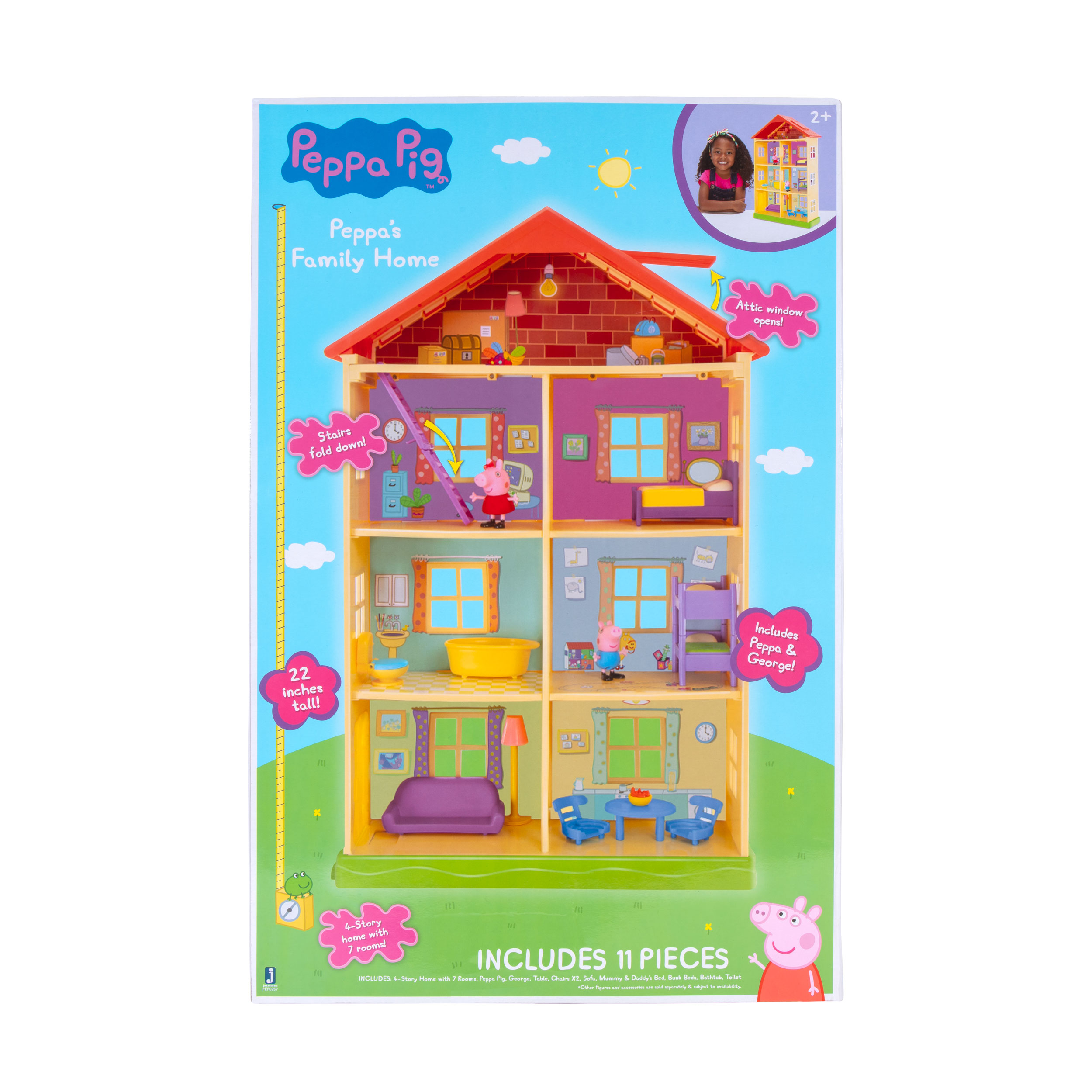 Reżyseruj sam scenariusze zabawy w 56 centymetrowym domku Świnki Peppy! Domek składa się z aż 4 poziomów, na których znajduje się 7 pomieszczeń: salon, kuchnia, pokój George’a i Peppy, łazienka, sypialnia rodziców, gabinet oraz strych. Domek zawiera wiele dodatków, które wzbogacą całą zabawę: otwierane okno oraz schody na strych, drzwi oraz ruchome akcesoria wyposażenia pomieszczeń. W domku znajdziesz również dwie figurki do zabawy: George’a i Peppę. Baw się i kreuj nowe historie!