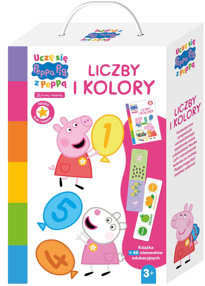 Polecana przez specjalistów linia produktów w pudełkach 'Uczę się z Peppą' wspierająca rozwój dziecka. Idealne uzupełnienie programu edukacyjnego linii książek Uczę się z Peppą. W środku przedszkolak znajdzie książkę 'Liczby i kolory' oraz 48 elementów edukacyjnych z liczbami i kolorami.